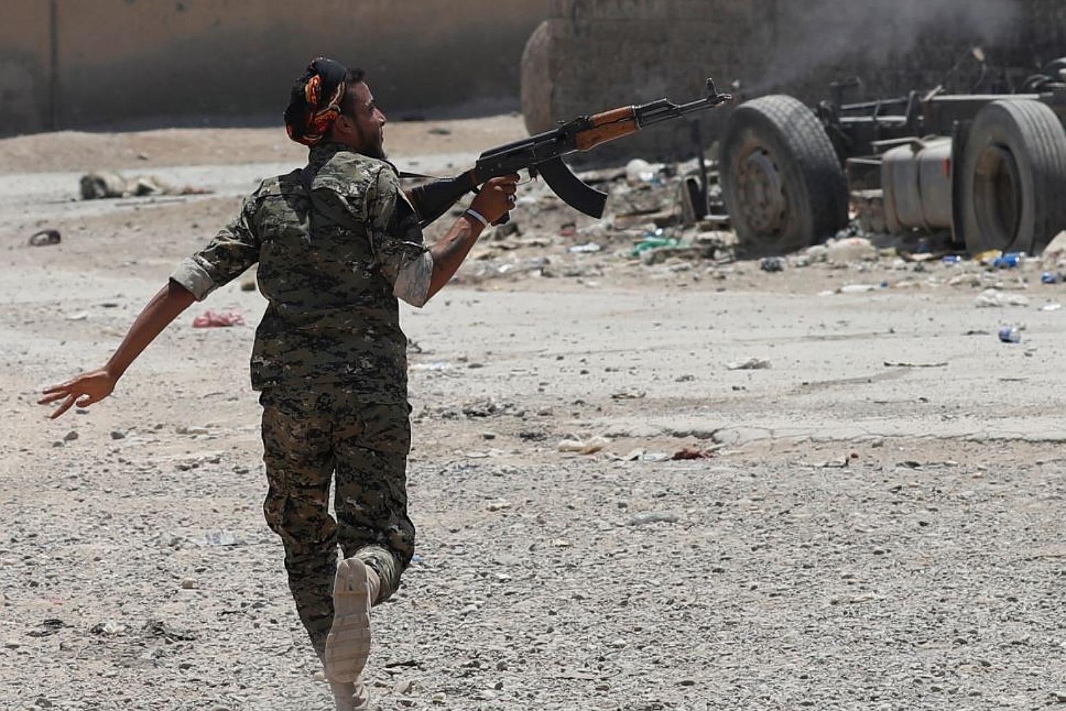 A Kurdish fighter from the People's Protection Units (YPG) fires his rifle at Islamic State militants as he runs across a street in Raqqa, Syria, on July 3, 2017.