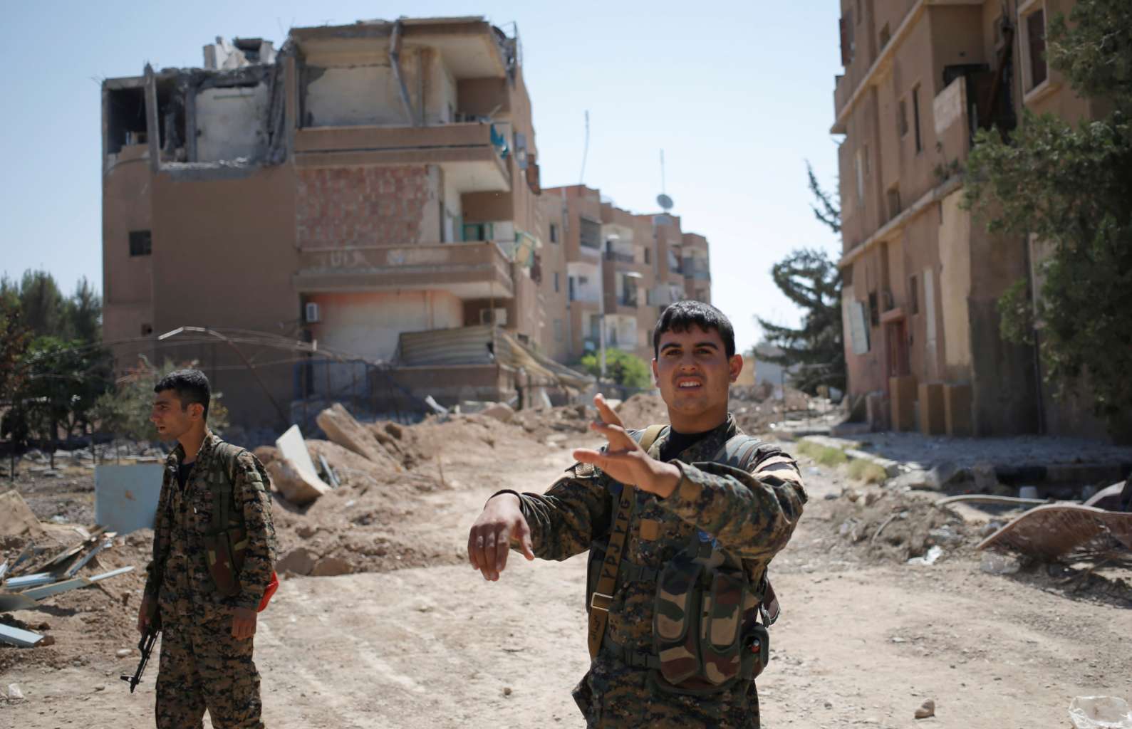 A Kurdish fighter from the People's Protection Units (YPG) gestures in Raqqa, Syria, on June 27, 2017.
