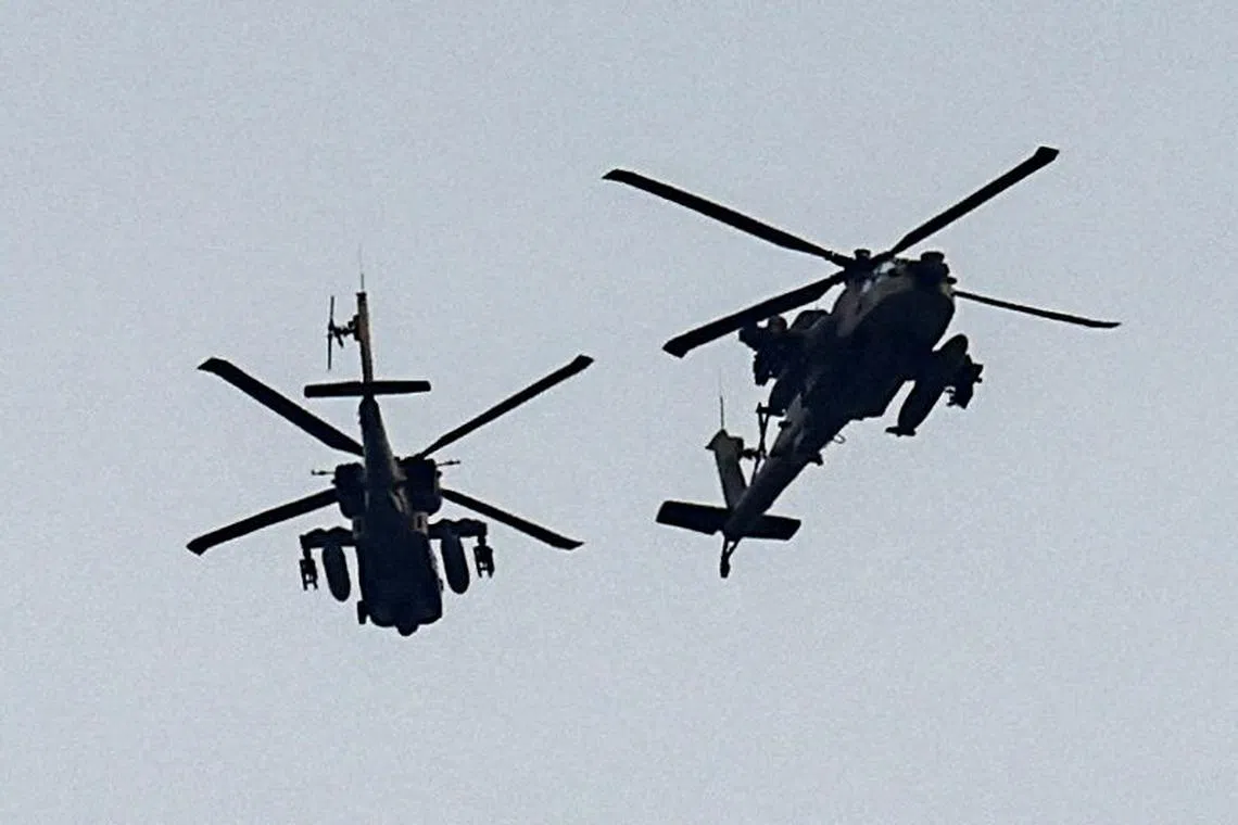 Israeli military helicopters flying near the Israel-Gaza border amid the ongoing conflict between Israel and the Palestinian Islamist group Hamas.