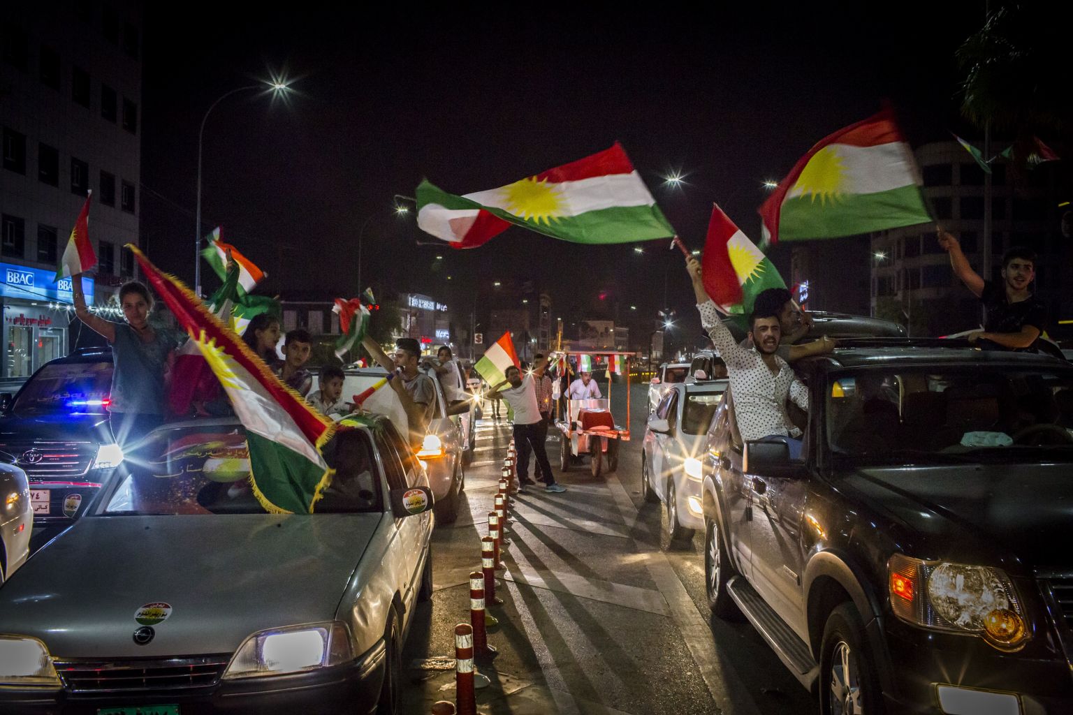People celebrate with Kurdish flags on the streets of Irbil, Iraq, after the results of the referendum.