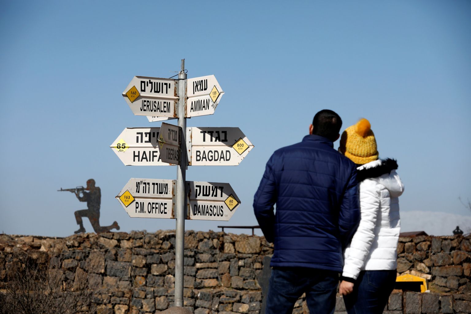 A couple look at signs pointing out distances to different cities, at an observation post in the Golan Heights.