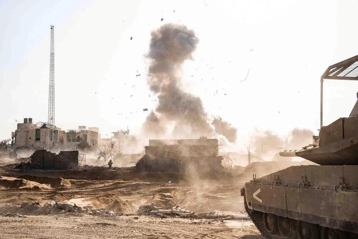 Smoke rises next to damaged buildings as Israeli military vehicles operate in the Gaza Strip.