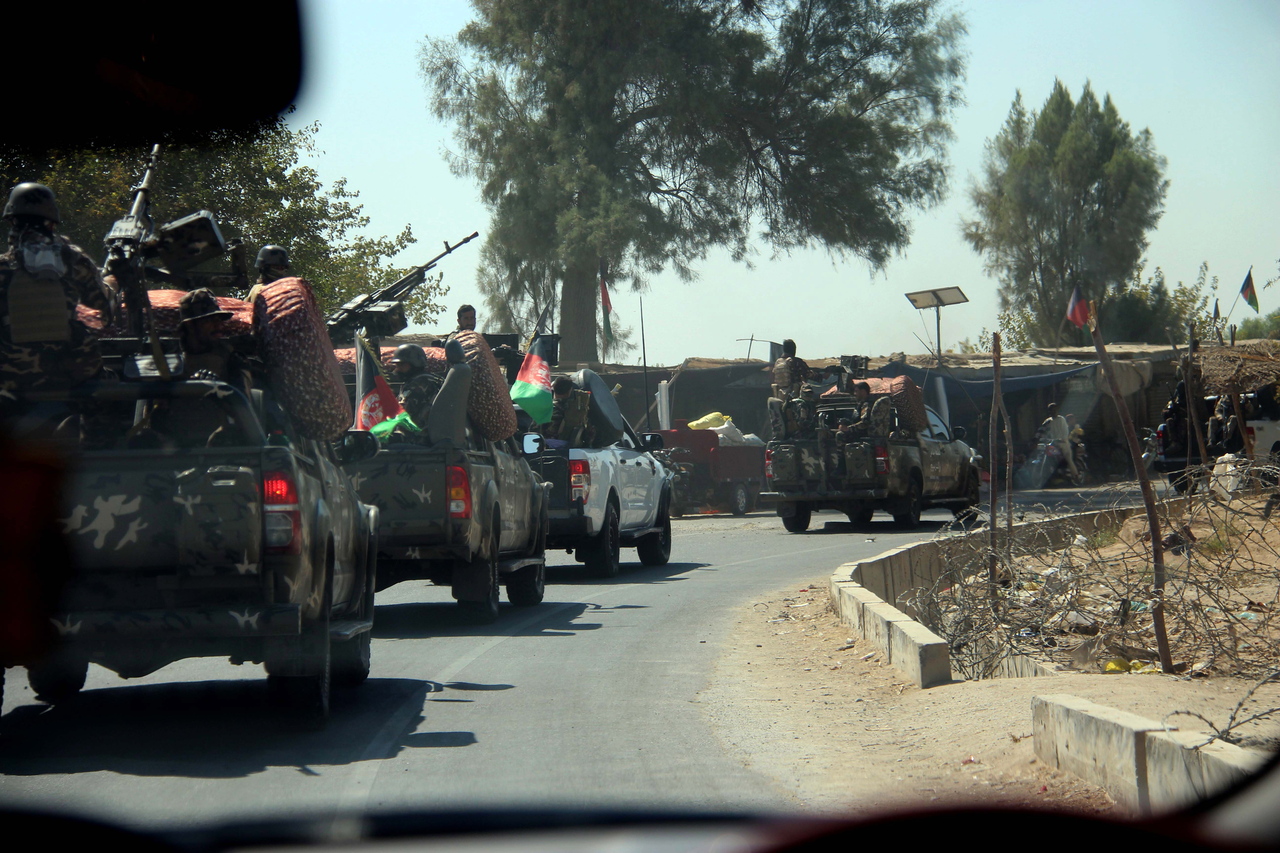 Afghan security officers patrolling the Helmand-Kandahar highway after the Taleban launched a large-scale attack in the province, on Oct 13, 2020.