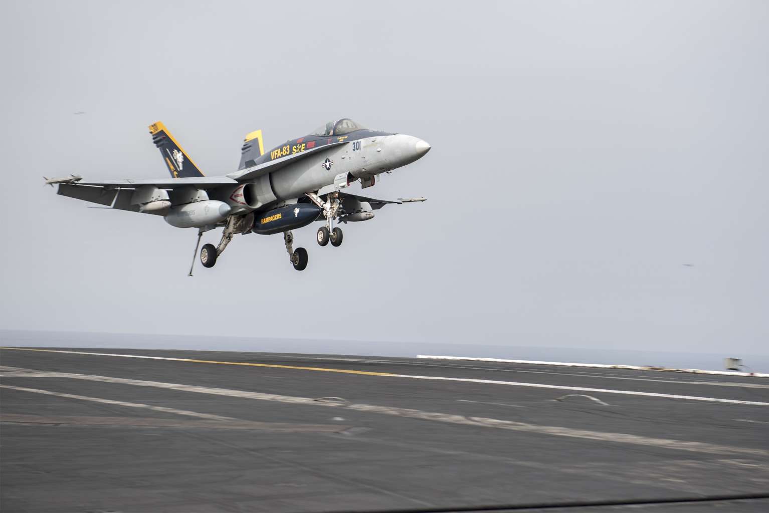 A US Navy F/A-18C Super Hornet prepares to land on the flight deck of aircraft carrier USS Harry S. Truman in the Mediterranean Sea on June 3, 2016.