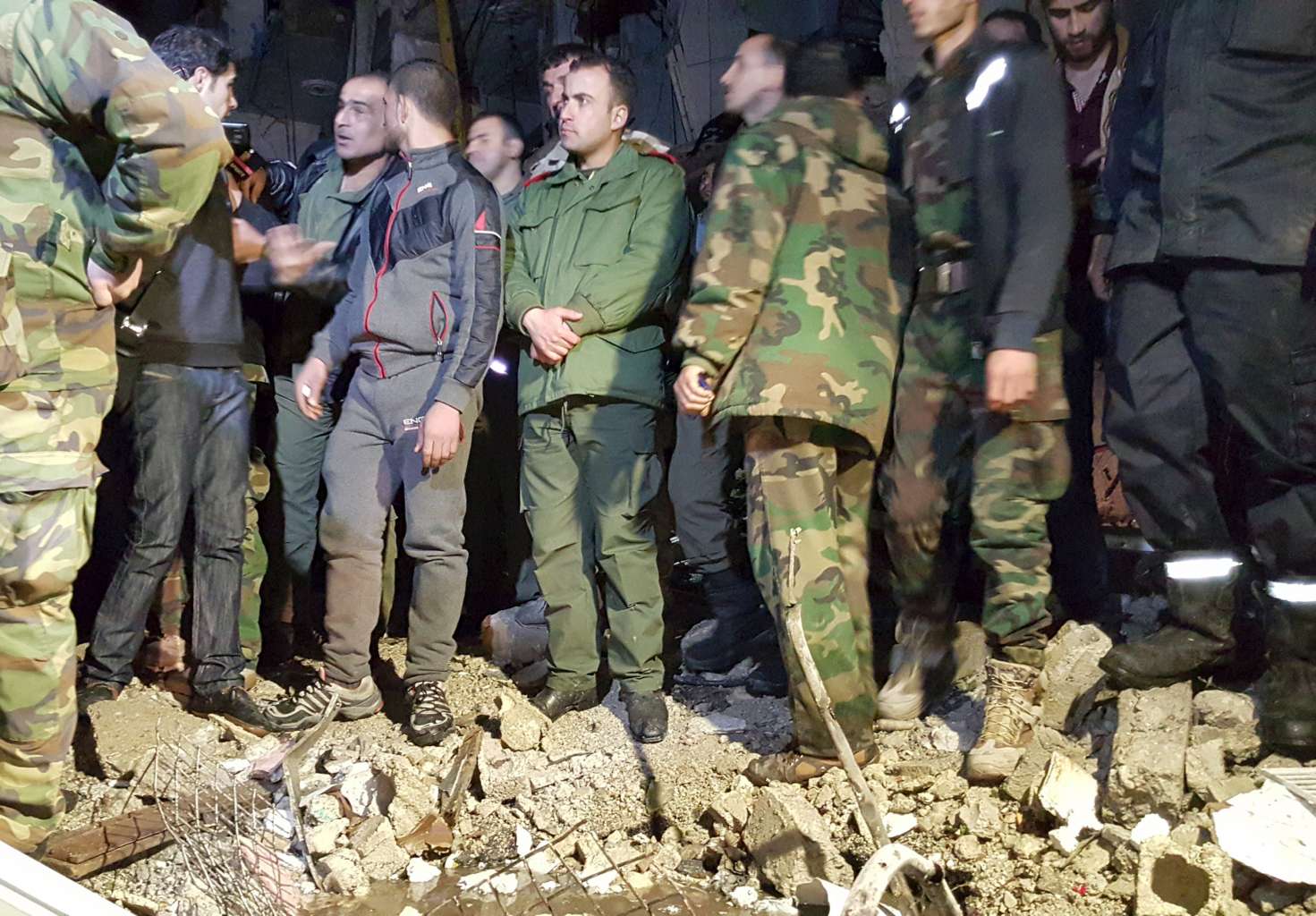 Syrian army soldiers and civilians inspect the site of multiple bomb blasts that hit the Sayeda Zeinab area, a southern district of Damascus on Sunday (Feb21).