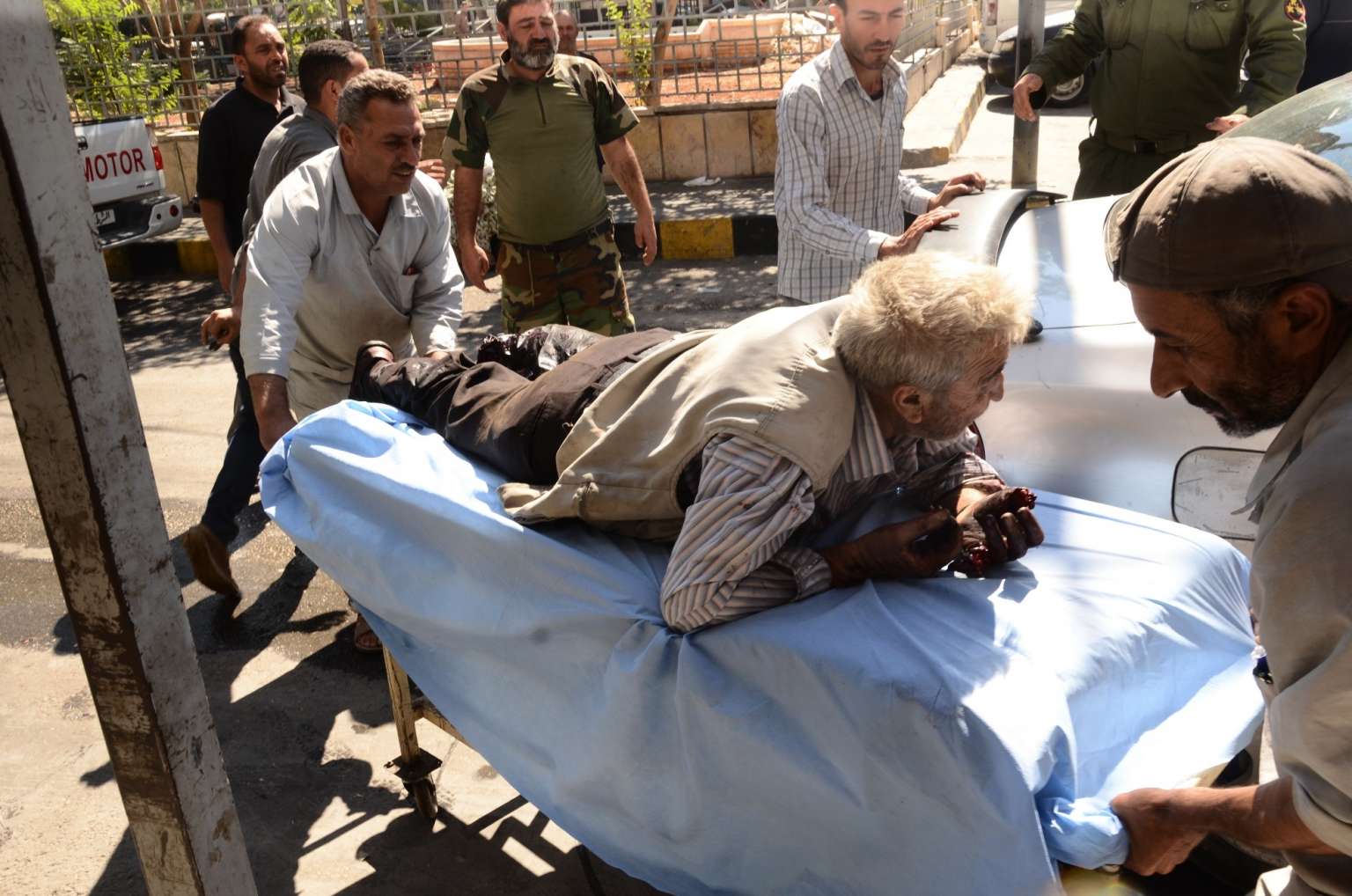 A wounded Syrian man is rushed into a hospital after he was hit by mortar shells targeting government-controlled Aleppo neighbourhoods on Sept 28, 2016.