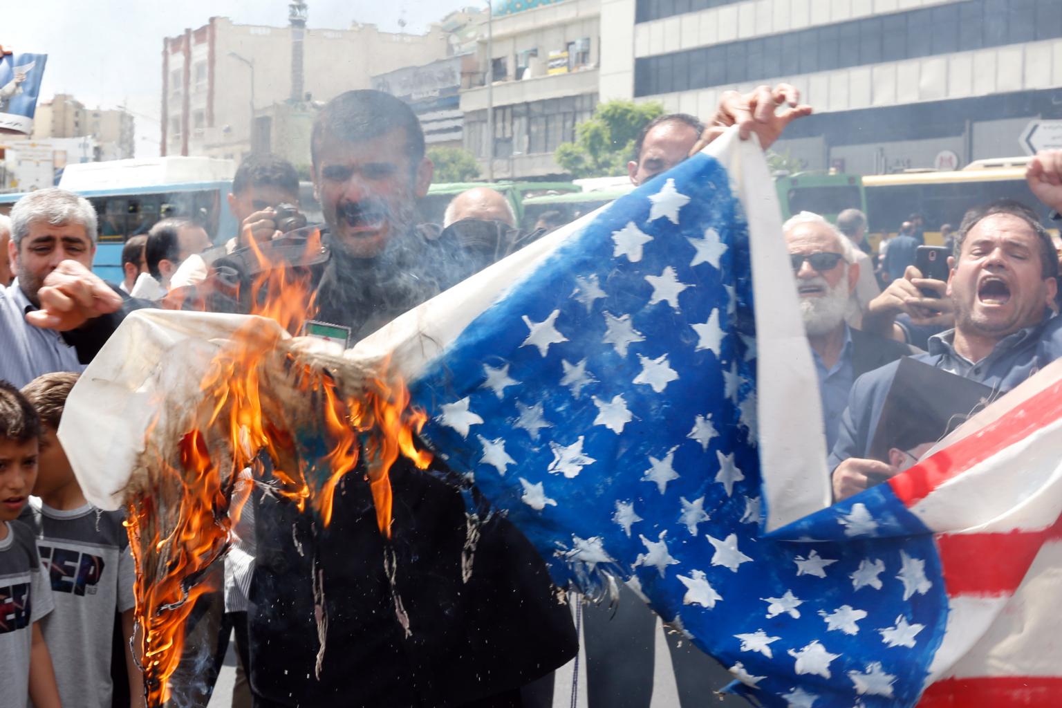 Demonstrators burn a US flag to show their support of Iran's decision to pull out from some part of the nuclear deal in Teheran on May 10, 2019.