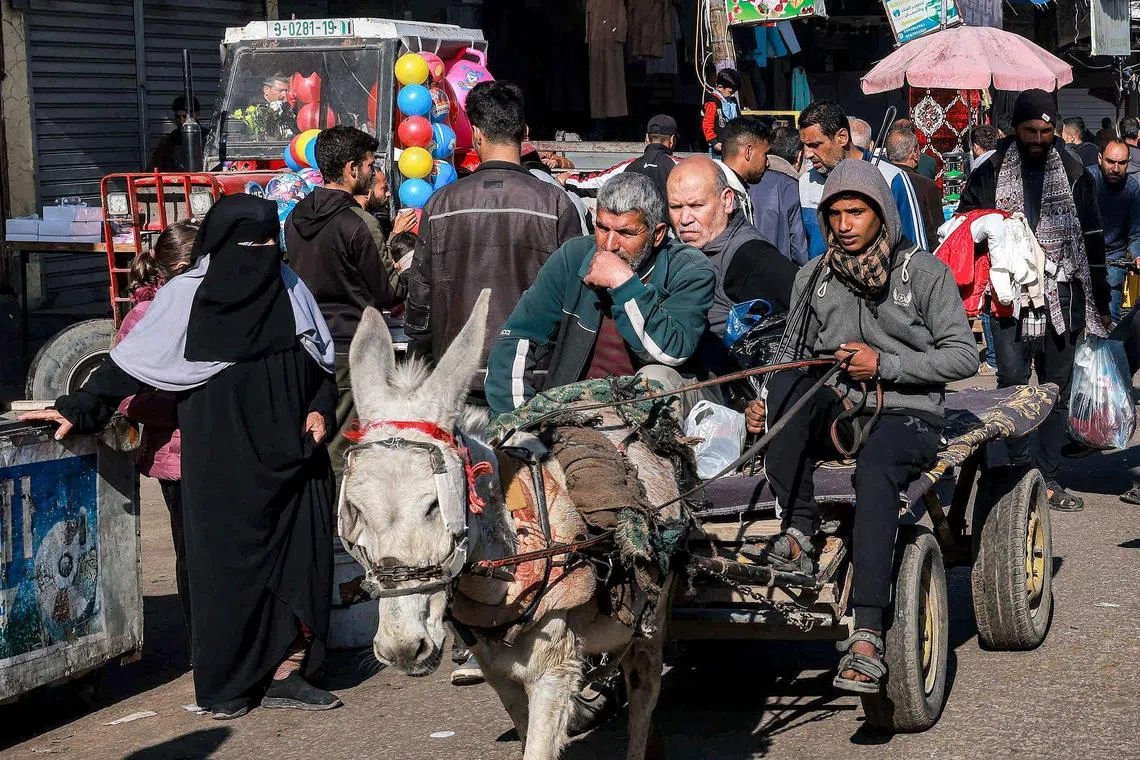 A youth drives a donkey-drawn cart along a crowded main street in Rafah, in the southern Gaza Strip.