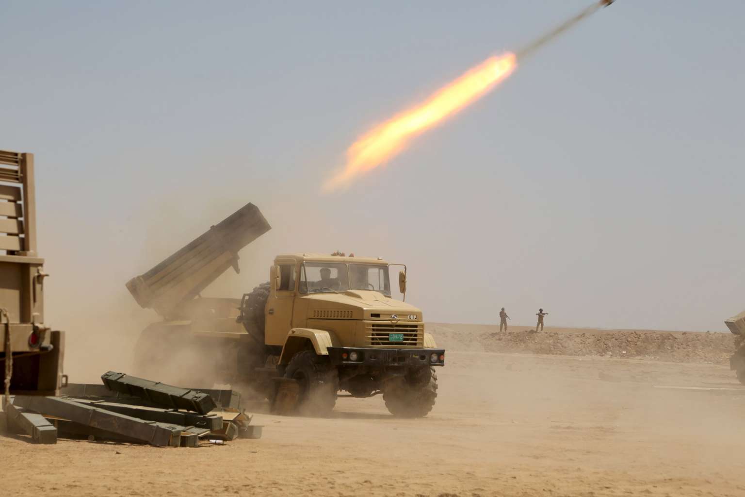 Iraqi security forces launch a rocket towards Islamic State in Iraq and Syria militant positions on the outskirts of Anbar province, Iraq, on Aug 22, 2015