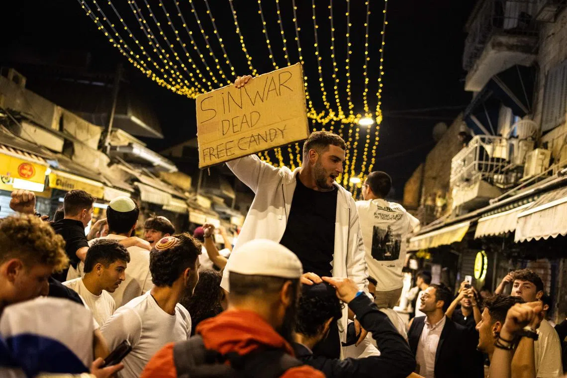 People celebrate after the Israeli military confirmed the death of Hamas leader Yahya Sinwar, in Jerusalem, on Oct 17.
