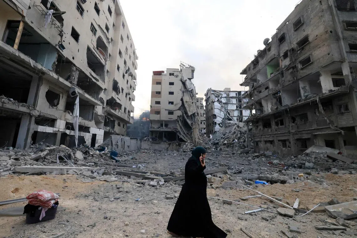 A Palestinian woman walks through a ravaged street following Israeli airstrikes on Gaza City.