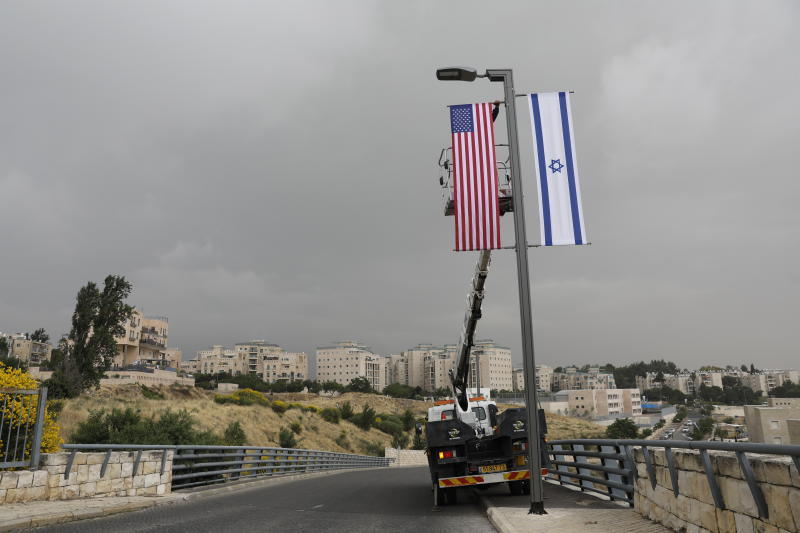Workers place flags along a road leading to the US consulate on the East-West Jerusalem line on May 7, 2018.