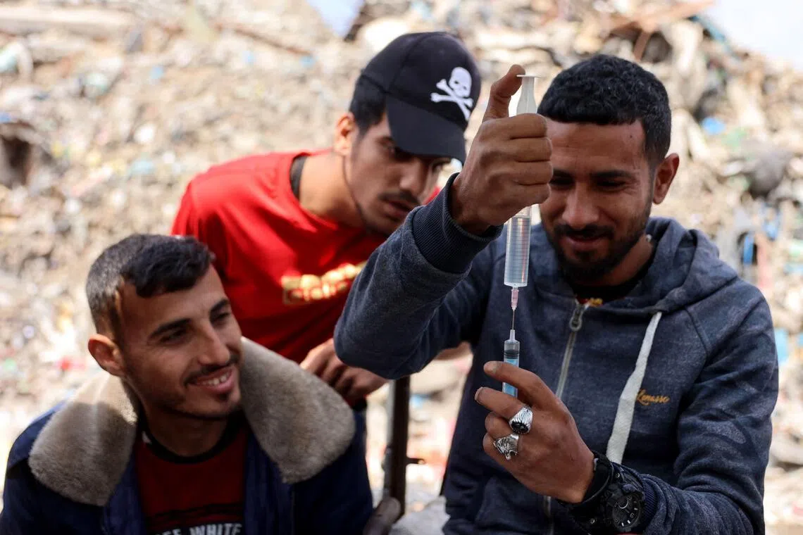 At his makeshift stall on a busy Gaza City street, he uses a syringe to inject liquid nicotine into a bag of dried jute leaves, using a large 1kg bottle of the type often confiscated by the Israeli military from trucks entering Gaza.