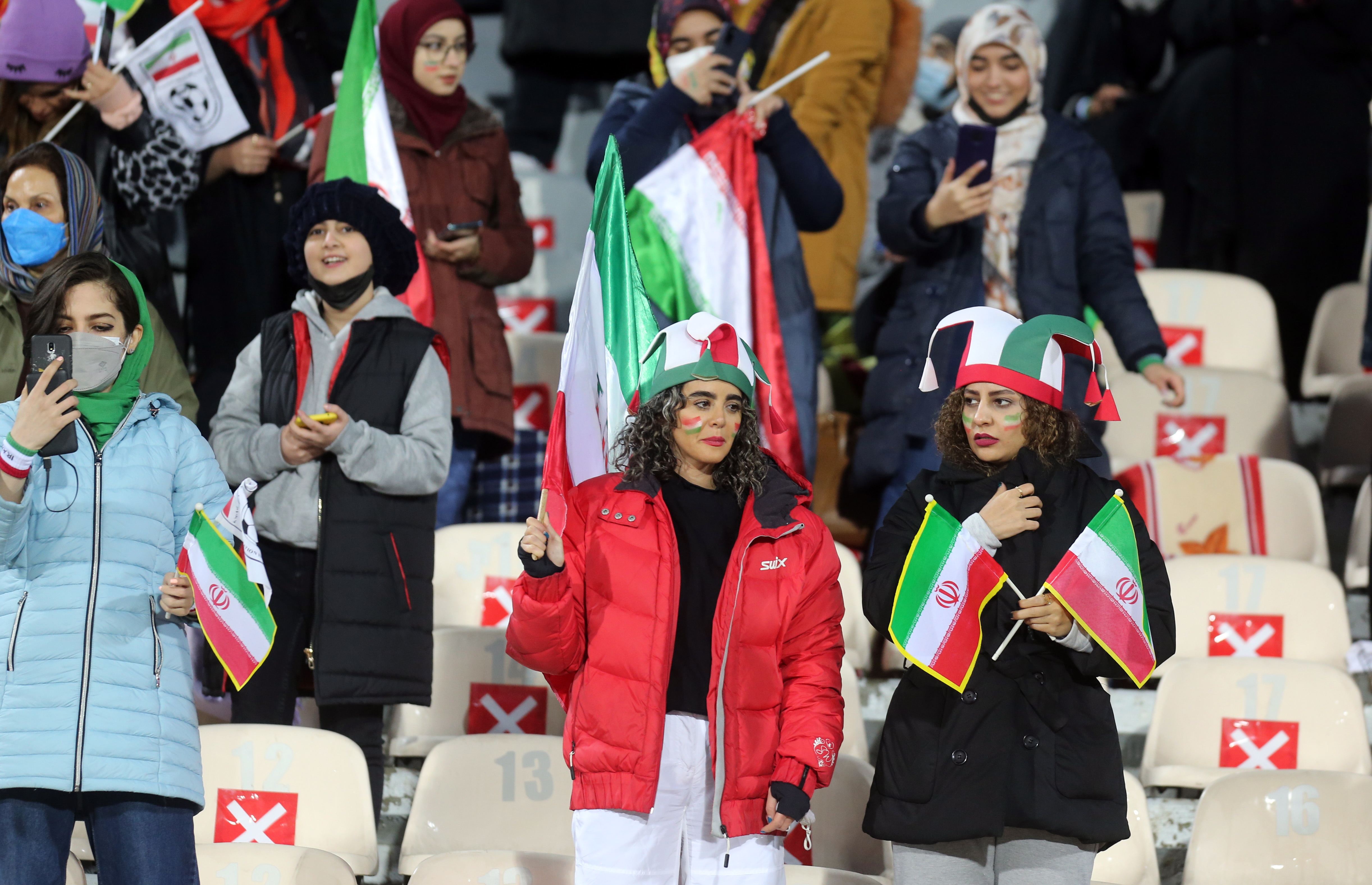 Wearing thick coats against winter's chill, some had the national colours painted on their cheeks, and many carried Iranian flags or horns in the national colours.