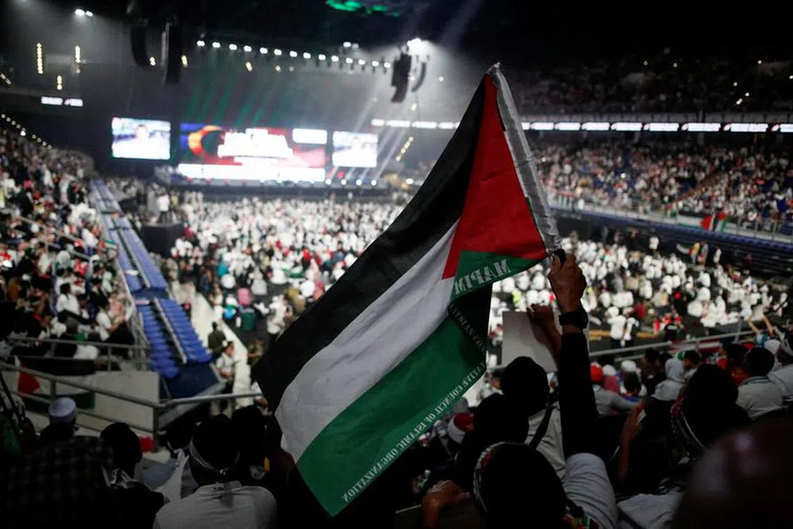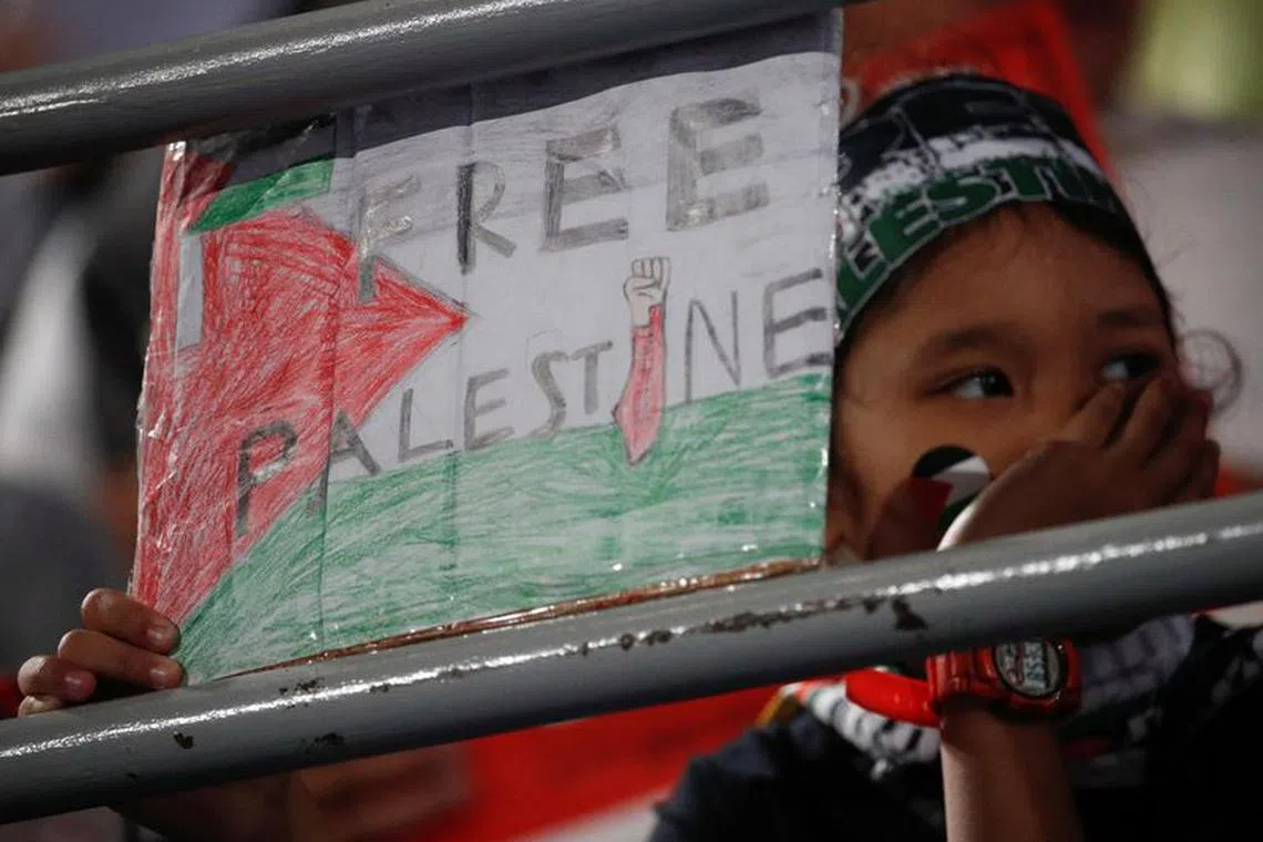 A child in Kuala Lumpur, Malaysia, on Oct 24 holding a drawing of a Palestinian flag during a solidarity gathering to show support for Palestinians.
