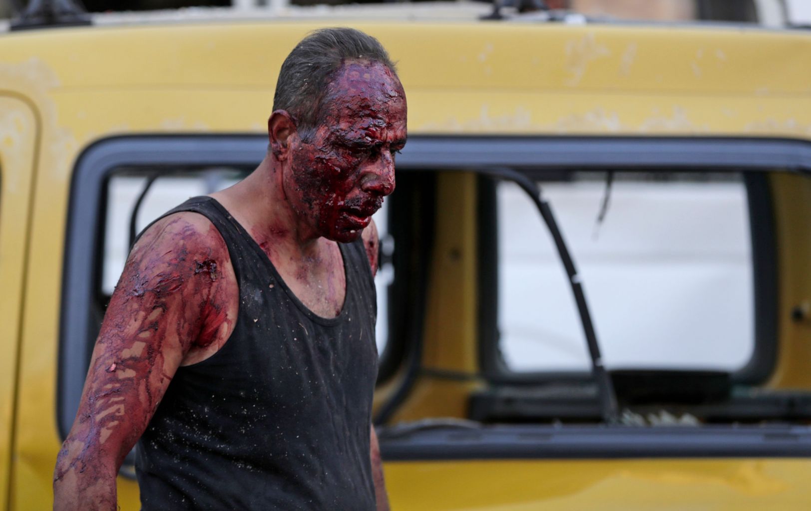 A wounded man walks at the port near the scene of the explosion in the Lebanese capital Beirut on Aug 4, 2020.