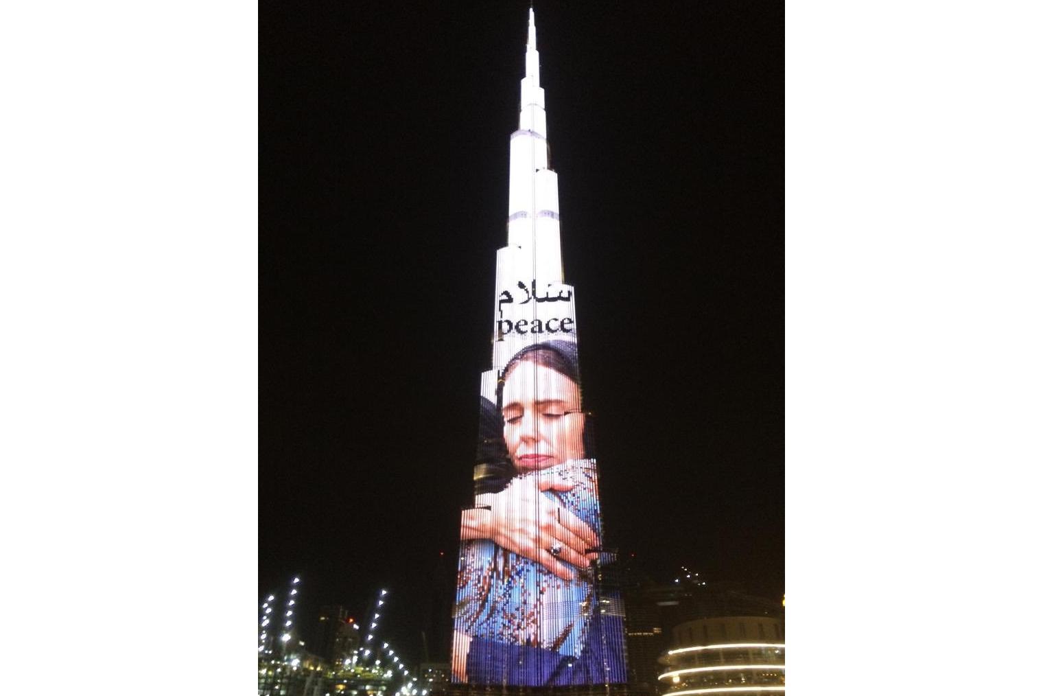 Featured on the 829m-tall Burj Khalifa in Dubai, United Arab Emirates, the image of Ms Ardern donning a headscarf and embracing a woman at the Kilbirnie mosque in Wellington was accompanied by the Arabic word "salam", or peace, The Sydney Morning Herald reported.