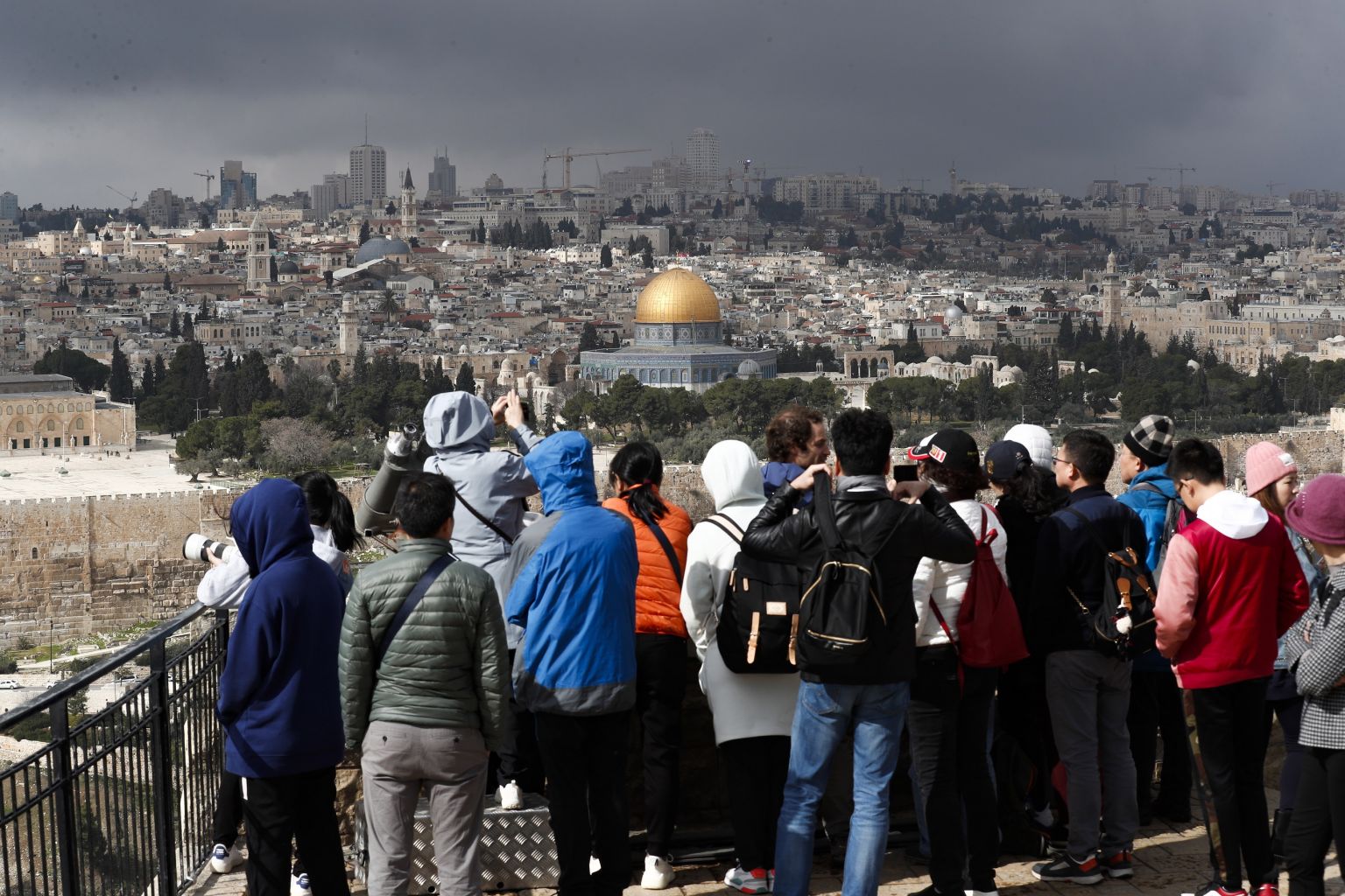 Tourists look at Al-Aqsa compound in the old city of Jerusalem from Mount Olives, Jan 29, 2020.