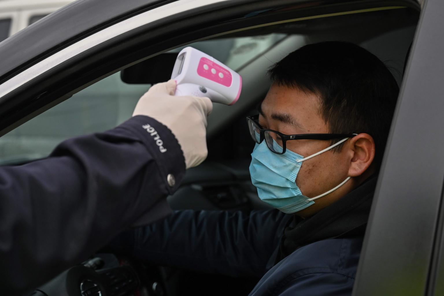 A police officer takes the temperature of a driver at a checkpoint in Wuhan, China, on Jan 27, 2020.