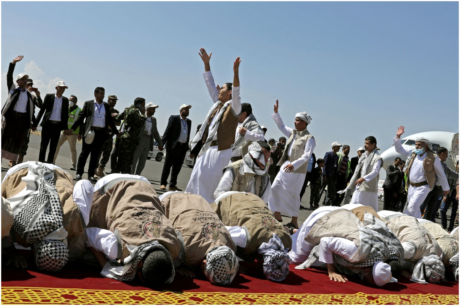 Freed Houthi prisoners pray as they arrive after their release in a prisoner swap, in Sanaa airport, Yemen, in 2020.