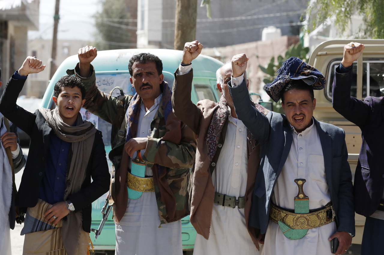 Pro-Houthis Yemenis shout slogans during an anti-US and Saudi Arabia rally in Sanaa, Yemen, on Nov 19, 2021.