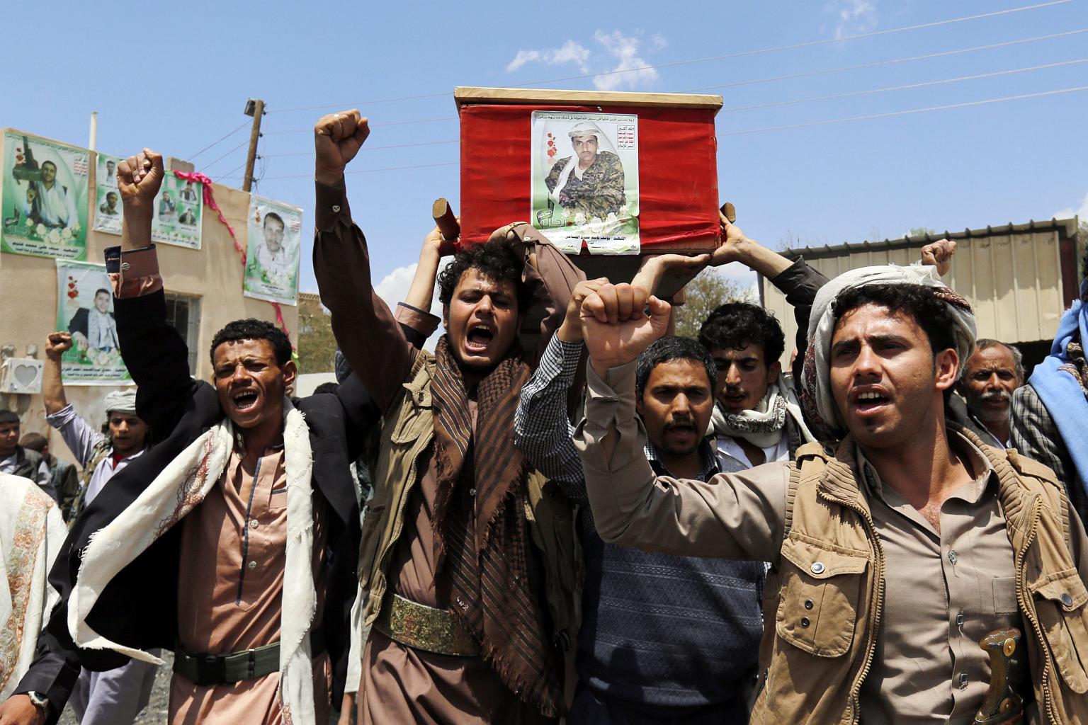 Houthi supporters carry the coffin of a militia member allegedly killed in recent fighting with Saudi-backed Yemeni forces ahead of a UN-announced ceasefire, on April 10, 2016.