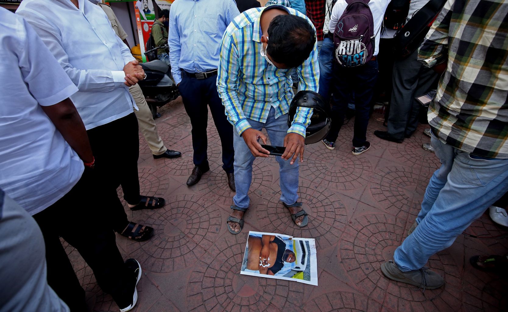 A photograph of a Congolese man who died in police custody is seen on a footpath outside a police station in Bangalore, India, on Aug 2, 2021.