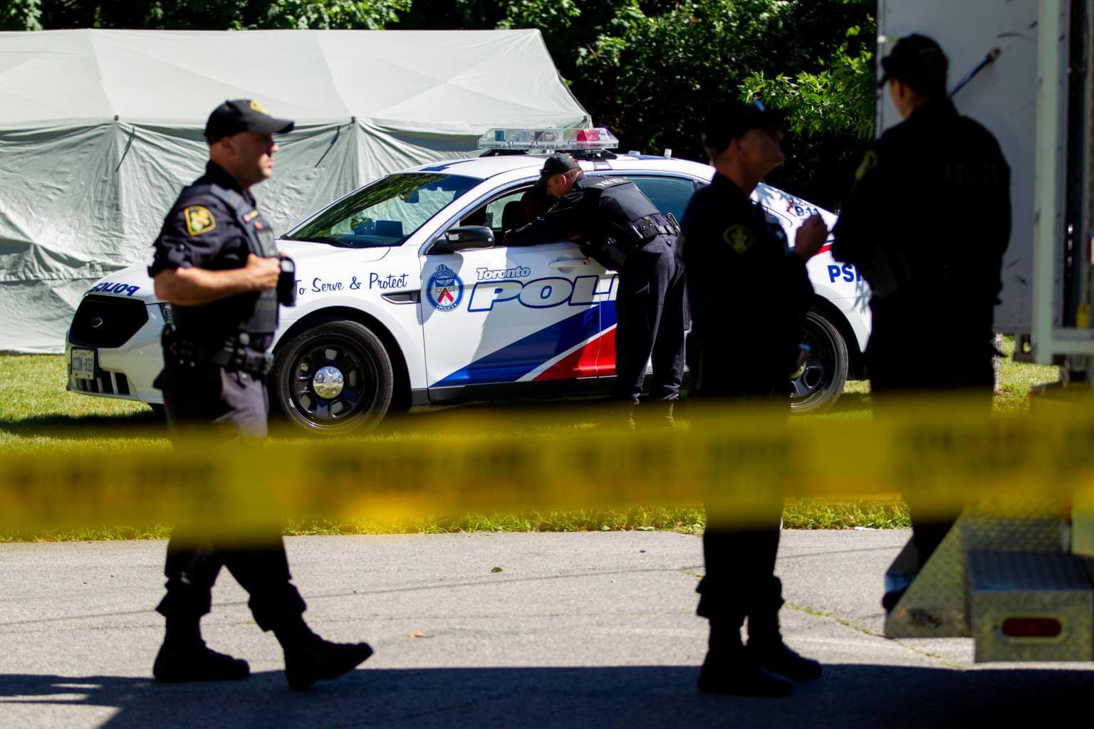 Members of the Ontario Provincial Police confer with colleagues after a third day of searching for human remains in a ravine behind a home on Mallory Crescent in Toronto, Ontario, July 6, 2018.