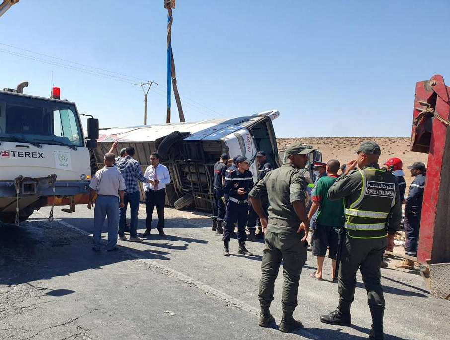 Rescuers and security forces gather at the scene of a bus crash on a motorway in Khouribga province, east of Morocco's economic capital Casablanca, on August 17, 2022.