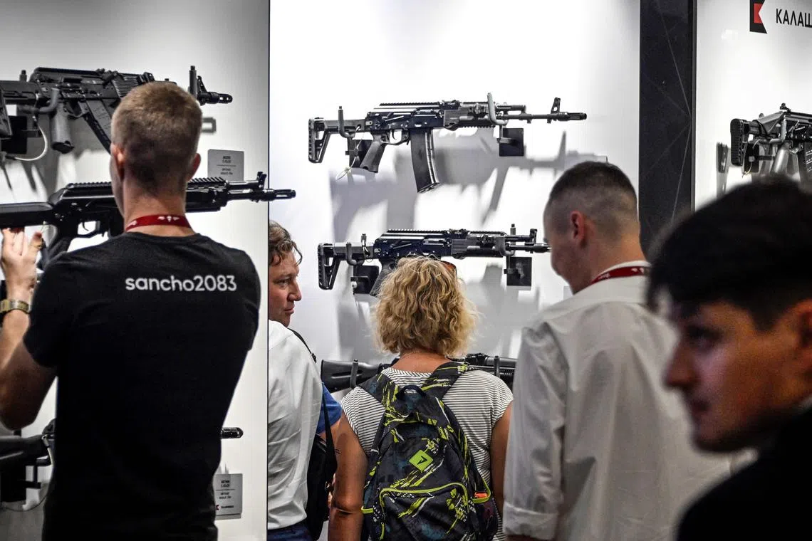 Visitors viewing firearms made by Russian weapons manufacturer Kalashnikov at the exhibition in Kubinka Patriot Park on Aug 15, 2023.