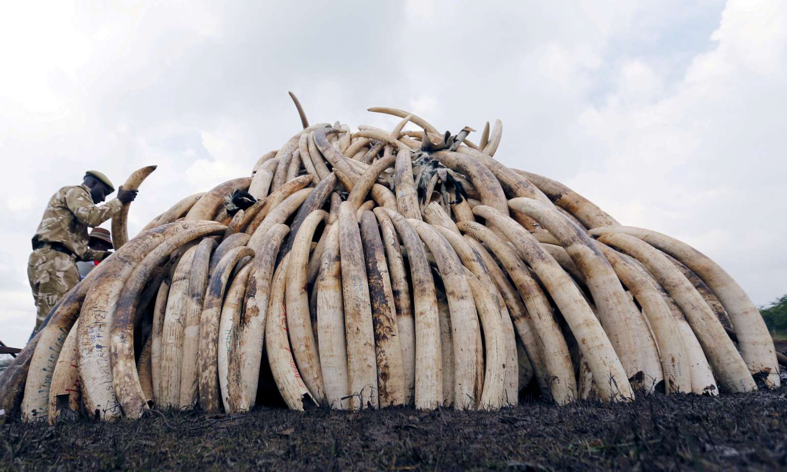 A Kenya Wildlife Service (KWS) ranger stacks elephant tusks, part of an estimated 105 tonnes of confiscated ivory to be set ablaze, on a pyre at Nairobi National Park.
