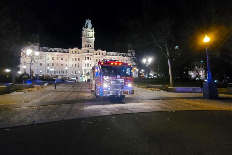 A firefighter truck is parked in front of the National Assembly in Quebec after two people were killed by a sword-wielding suspect on Nov 1, 2020.