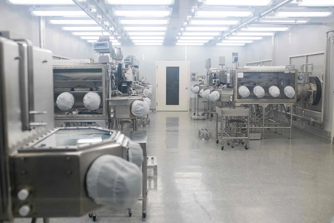 Long white sleeves hang from the huge metal and glass box in which the sample will be handled.
