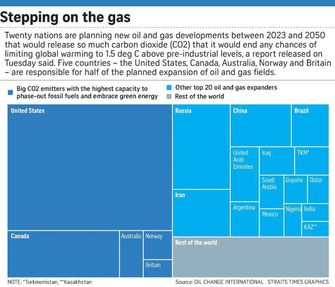 SINGAPORE - Nearly two dozen countries are planning new oil and gas fields and fracking wells that, if developed, would doom any chance of the world limiting warming to 1.5 deg C, a report released on Tuesday showed.