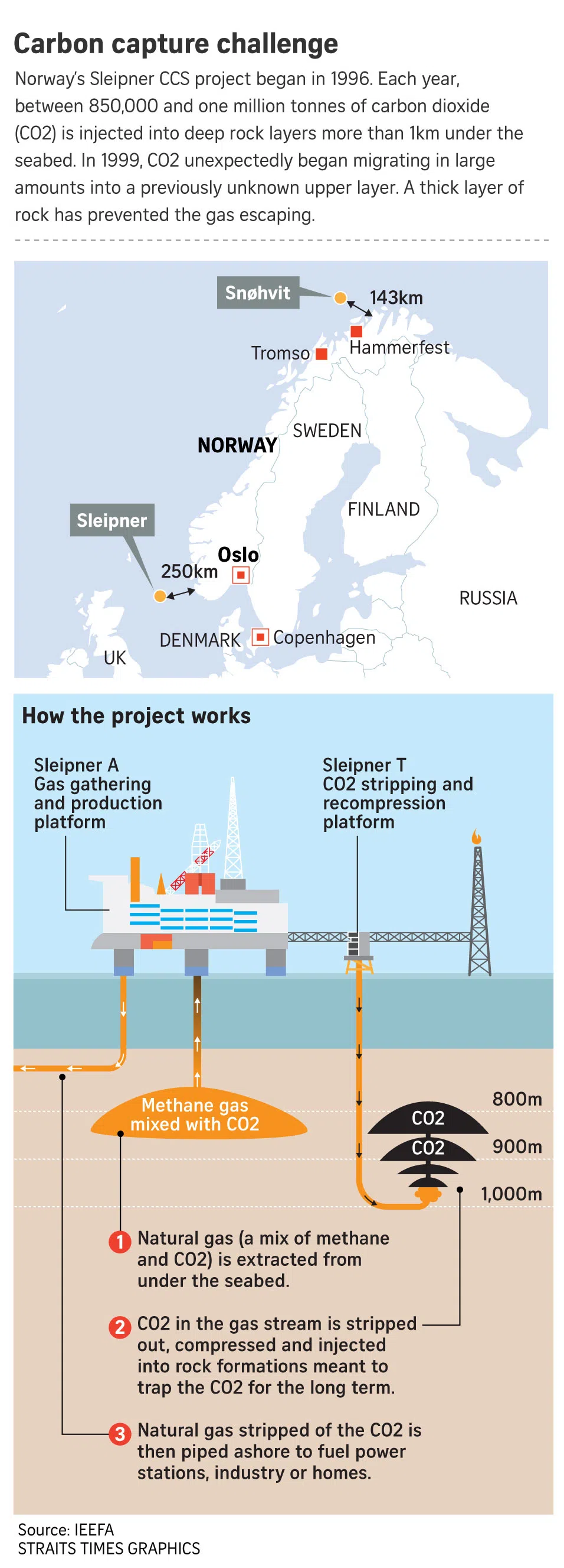 At Norway's Sleipner, carbon dioxide is injected more than 1km under the seabed.