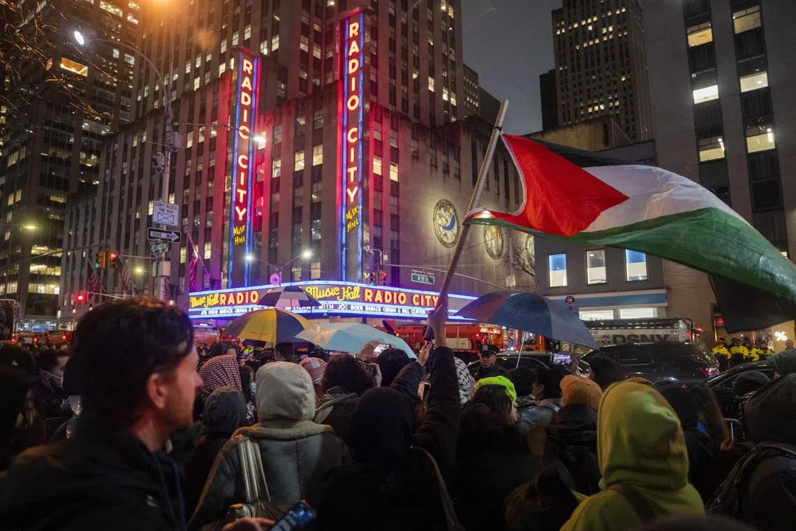 Pro-Palestinian protesters in front of Radio City Music Hall, where President Joe Biden and former Presidents Barack Obama and Bill Clinton were holding a fundraiser in New York.