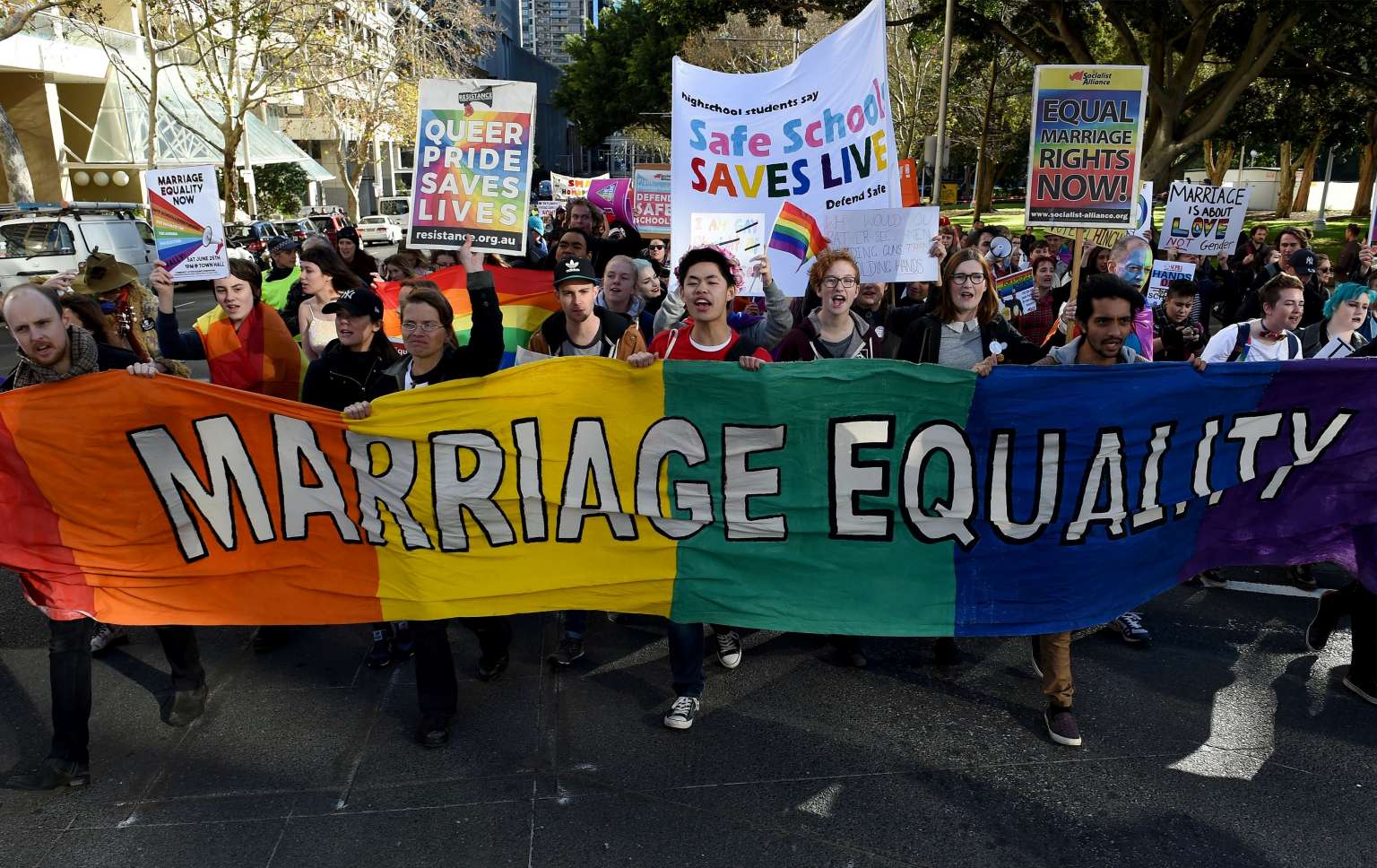 A file photo taken on June 25, 2016, shows pro-gay marriage supporters carrying a rainbow banner and flags during a rally in Sydney.