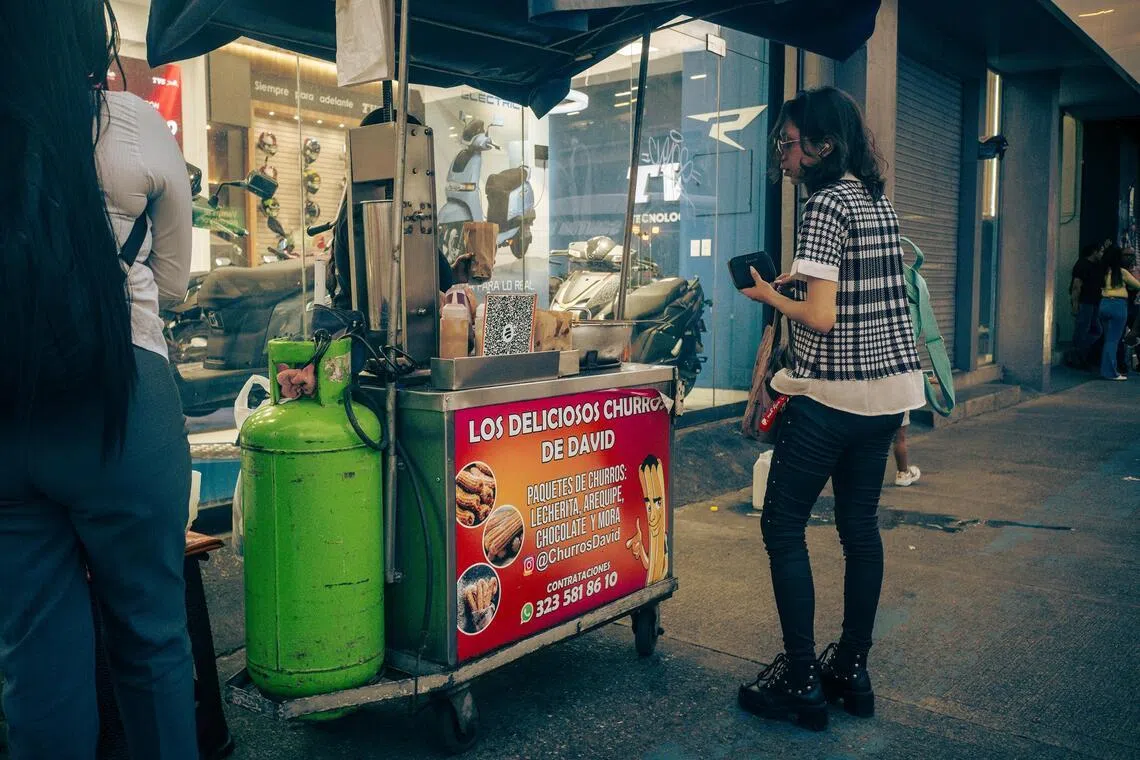 A street vendor selling churros from a cart on a pavement in downtown Medellin, Colombia, using a tank of cooking gas to heat the frying oil on March 19.