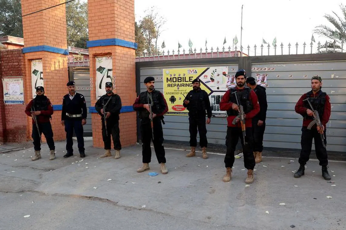 Police officers standing guard outside a polling station in Gulbahar area in Peshawar, Pakistan, on Feb 8.