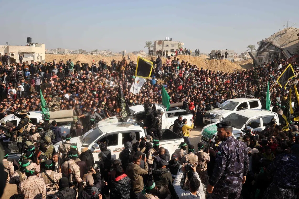 Crowds gathering as Palestinian Hamas and Islamic Jihad fighters arrive near the family home of slain Hamas leader Yahya Sinwar, where the Hamas militant group prepares to hand over Israeli and Thai hostages to a Red Cross team in Khan Younis on Jan 30.