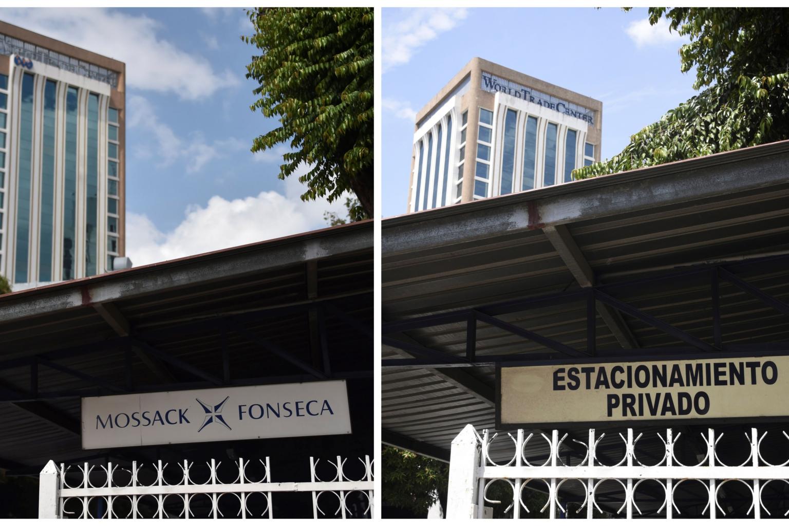 This photo composition shows a sign outside the building where Panama-based Mossack Fonseca law firm offices are located on April 4, 2016 (left) and March 30, 2017 in Panama City.