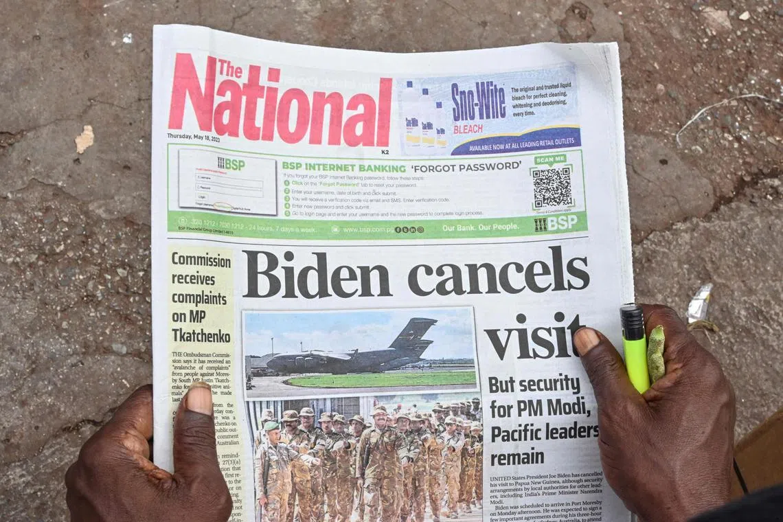 A man reading a newspaper report on the cancellation of a visit to Papua New Guinea by US President Joe Biden in Port Moresby on May 18.