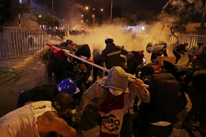 The largest march in Lima attracted thousands of people, with police again using tear gas fired from helicopters to disperse protesters who were threatening to march towards the Congress building.