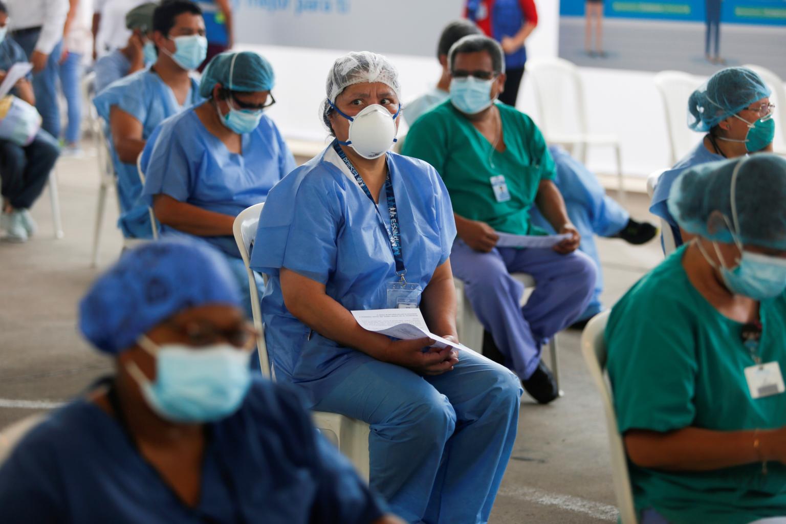 Health workers wait for a dose of the Sinopharm's coronavirus disease vaccine in Lima, Peru, on Feb 9, 2021.