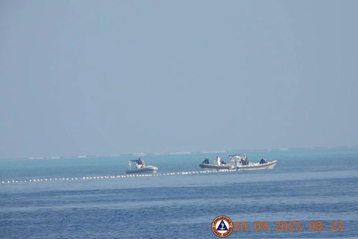 The Philippines expressed outrage on Nov 10 and shared images of Chinese coastguard policing a long, ball-buoy barrier near the Scarborough Shoal, a rocky outcrop 200km from the Philippines and the site of years of intermittent flare-ups over sovereignty and fishing rights.