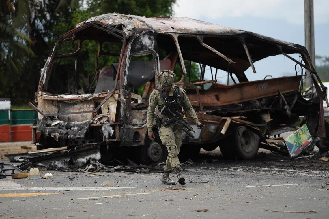A member of the Colombian Armed Forces walking around the wreckage of a bus destroyed in a bombing on a toll road near Villa Rica, Colombia, on June 10.