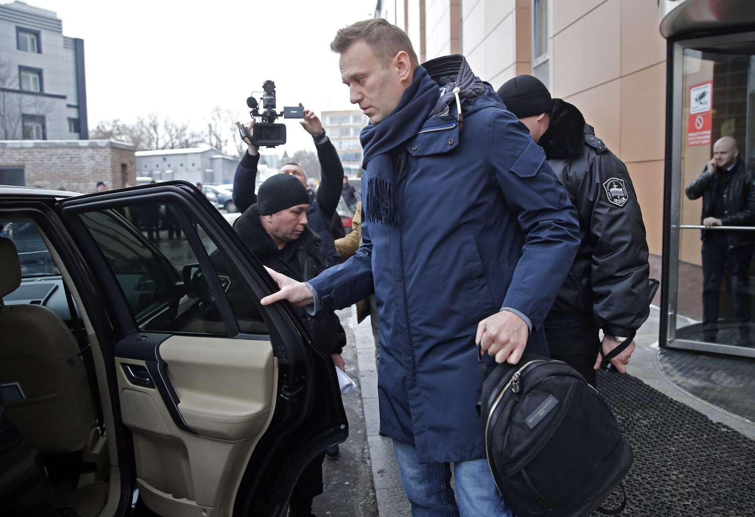 Russian opposition leader Alexei Navalny (centre) is escorted by Moscow bailiffs to a car from the Anti-Corruption Foundation headed by Navalny in Moscow, Russia, on Jan 31, 2017.