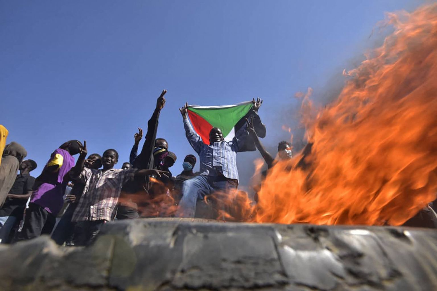 A man holds a Sudanese national flag before flames at a barricade, as people protest against the military coup in Sudan.