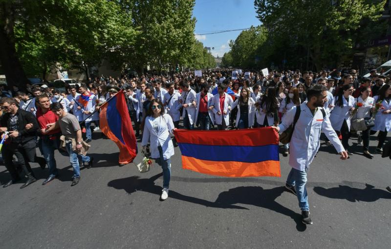 Hundreds of students, some medical students in white coats, also marched arm-in-arm through the streets, holding Armenian flags.