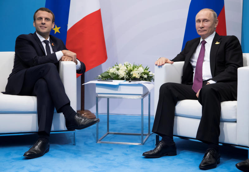 French President Emmanuel Macron (left) and Russian President Vladimir Putin attend a bilateral meeting on the second day of the G20 summit in Hamburg, Germany, on July 8, 2017.